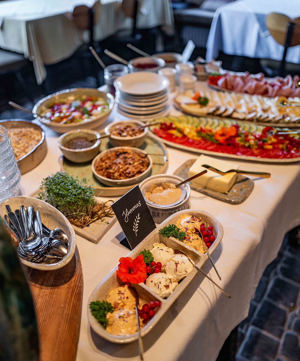 Als Hotelgast genießt du bei uns morgens ein reichhaltiges Frühstücksbuffet mit vielen kleinen Köstlichkeiten und abends ein raffiniertes Vier-Gänge-Menü im feinen Stil.