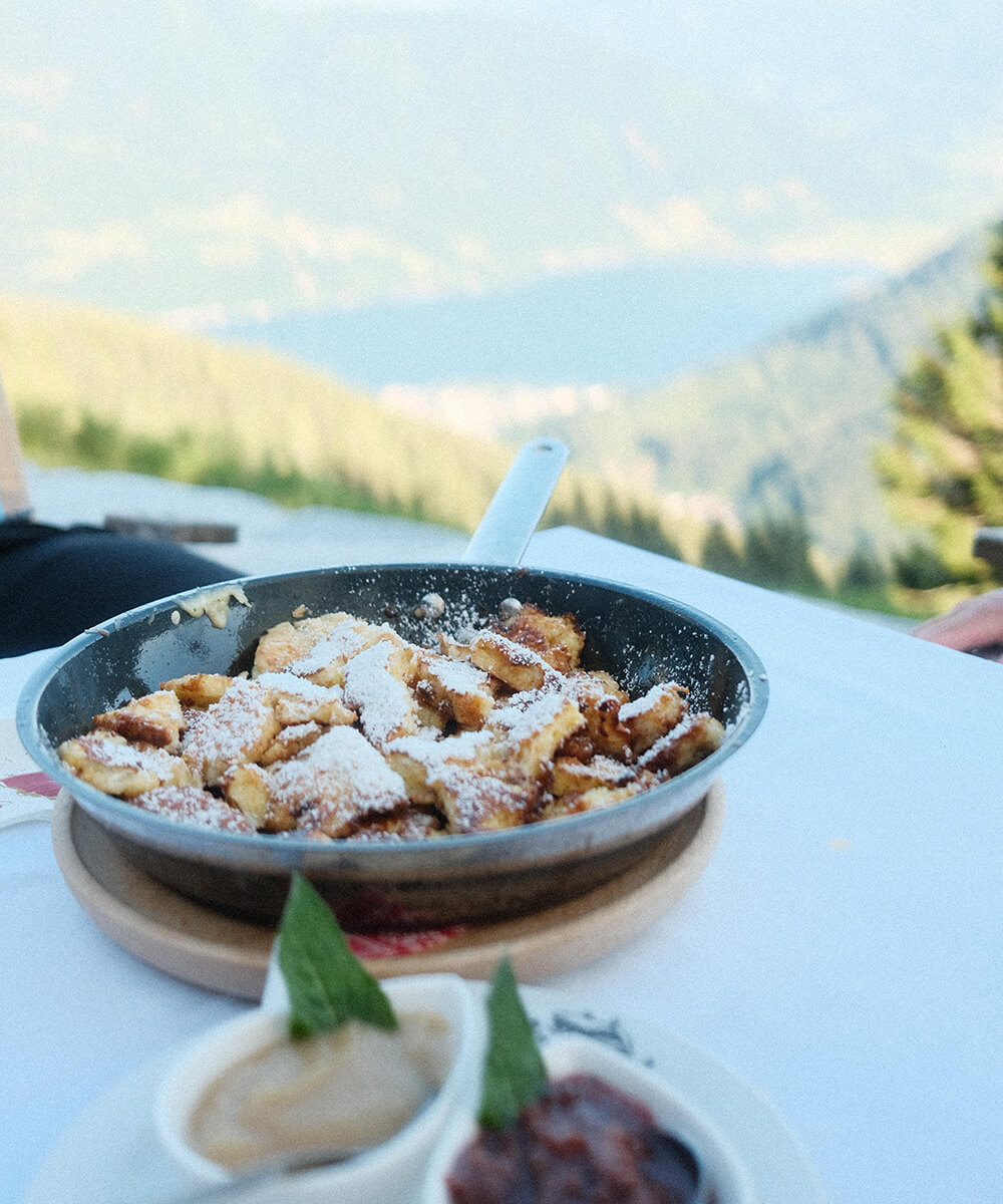 Und wenn dich mittags der Hunger packt, kannst du dich – genau wie unsere Tagesgäste – durch unsere vielfältige Speisekarte probieren. Hier treffen Tradition und Hausgemachtes auf echte Klassiker: Tiroler Gröstl, Kasnockn, Kräuterpalatschinken oder lieber etwas Süßes wie Apfelstrudel, Buchteln oder Kaiserschmarren.